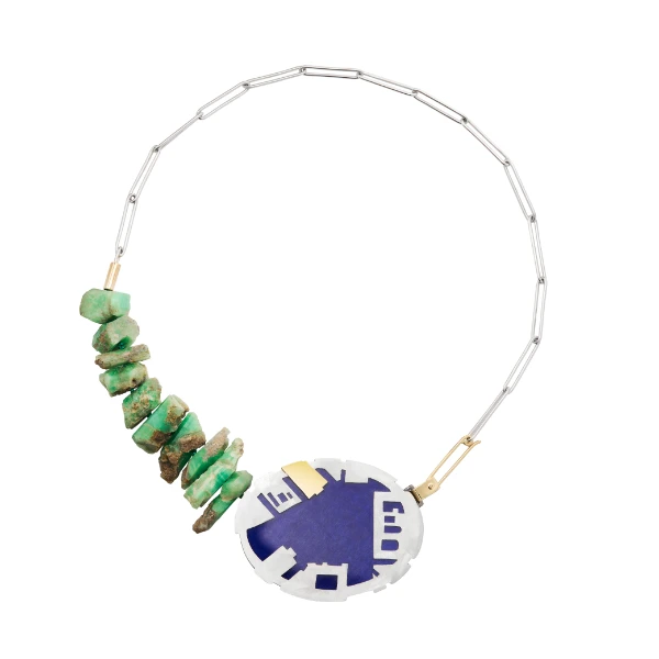 Lapis lazuli’en er slebet efter Kongens Nytorvs form. Motivet på den blå side er et kort over torvet, som det ser ud i dag med d’Angleterre fremhævet i guld. På den gråmelerede bagside ses glimt fra fortiden – byggeri både over og under jorden, brosten lagt og taget op, men også til minde om de hoveder, der rullede på pladsen, der en gang blev anvendt til henrettelser. Smaragderne fortæller historien om Krinsen, der fik elmesyge, og som efterfølgende blev erstattet af lindetræer