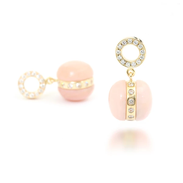 Guldsmed Mette Rosgaard har med stor humor omsat den lille franske kage kendt som macarons til et par bedårende øreringe. Pink opal illuderer de sprøde toppe og bunde af italiensk marengs, og et bånd fattet med brillanter udgør det lækre fyld
