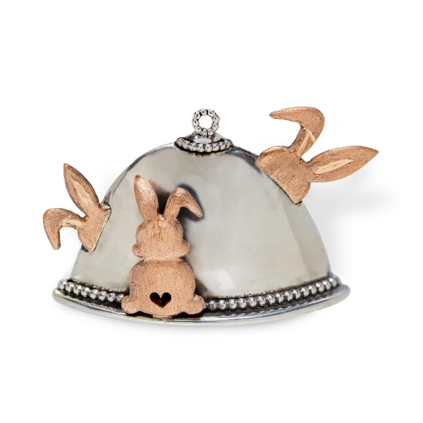 Med Maisons klassiske påskekage – en påskehare – fik guldsmed Tasja Vium Bruun hurtigt lyst til at formgive en broche inspireret deraf. Med udgangspunkt i Maisons logo, der er en sølvklokke, der dækker over en tallerken, hilser tre kækt-hoppende forårsbebudere på os