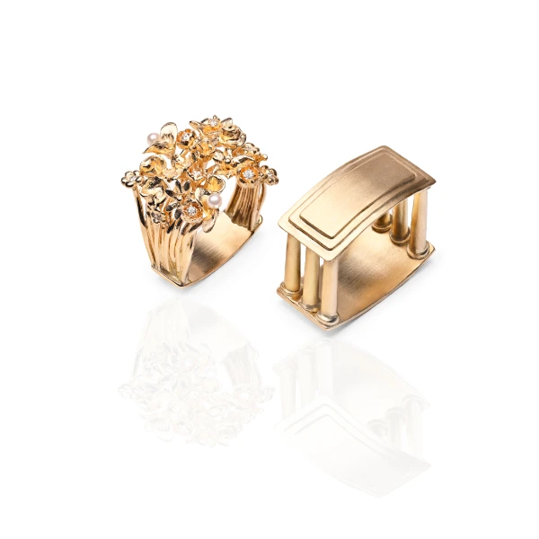 I sit arbejde med gelænderet som motiv fra den store trappe i hotel d’Angleterre blev guldsmed Ole Mørck draget af de mange, smukt-udformede balustre, der holder gelænderet. Den smukke formgivning er gengivet en miniature i den smukke ring