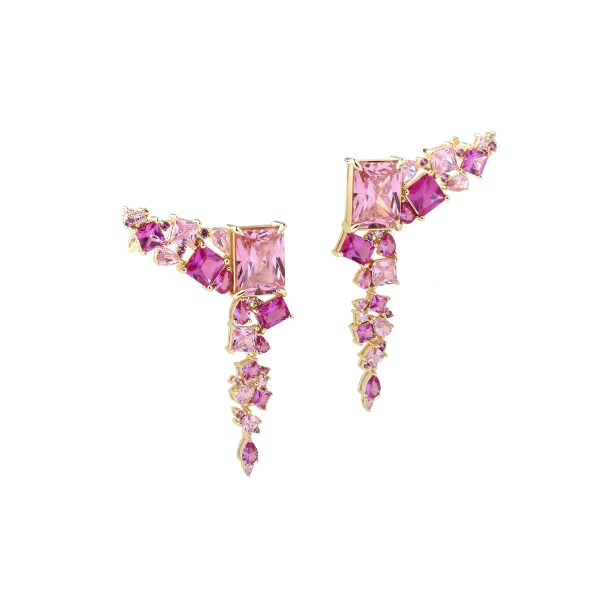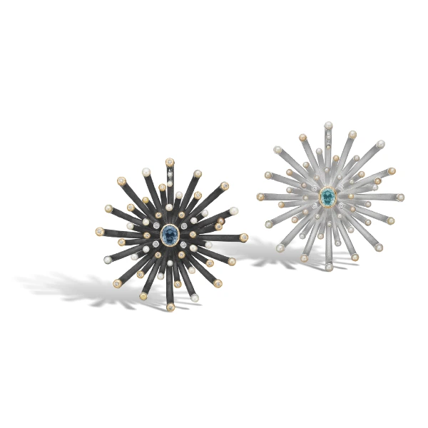 Med pejsen som husets hjerte rummer d’Angleterres nyklassicistiske af slagsen ilden, der changerer mellem rødt, hvidt og blåt. Øreringene er holdt i tilsvarende elegante linjer og farver: Morganithjerterne svæver mellem farveløse brillantlinjer over et brusende flammehav, og tanzanitterne udgør flammernes blå spidser