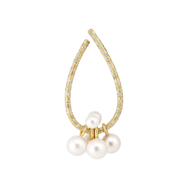 Af 18 karat guld, i alt 0.15 carat diamanter og to kulturperler (diameter 2,5 mm)