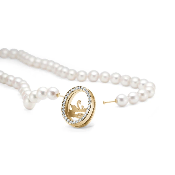 Af 14 karat guld, hvidguld og rosa guld, fire cabochonslebne diamanter (i alt 1.8 carat) og seks South Sea kulturperler (diameterstørrelser på 7 – 10 mm)