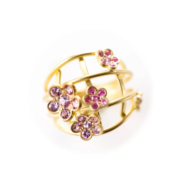 Inspireret af buketter af roser og hjerteformede balloner har guldsmed Mynte Kromann foreviget kærlighedserklæringerne i de grønlandske rubiners vidunderlige nuance, fattet i hjerterammer af guld, der svæver over ringskinnen som små balloner. Hver stilk ender i en lyserød diamant