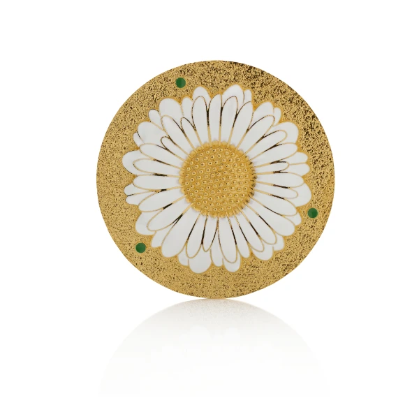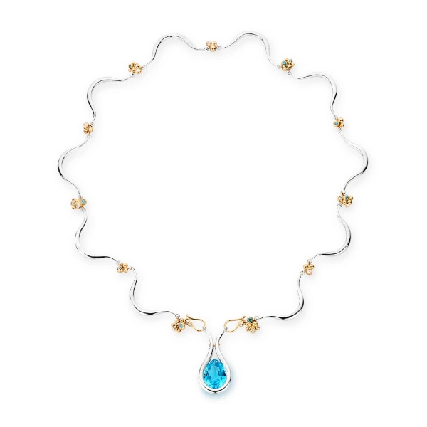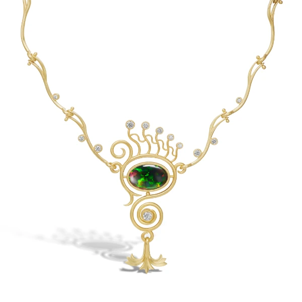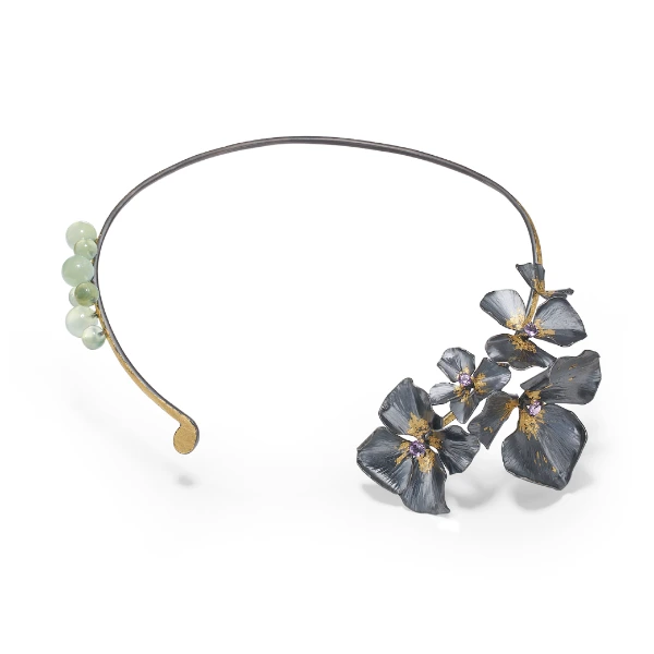 Unikahalsringens materialer afspejler d’Angleterres lobbys blomsterarrangementer: Ametyster tilfører et strejf af eksklusivitet, bladguldet langs halsringen og blomsternes midte reflekterer det runde bords gyldne detaljer, og de grønne prehnitter skaber en harmonisk balance. Som hotellet kombinerer smykket klassisk luksus med en storslået og indbydende lethed