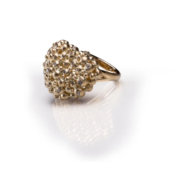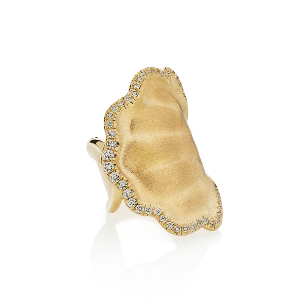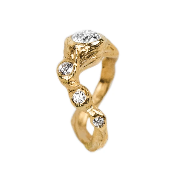 Ran er det japanske navn for orkidé – blomsten, der snor sig gennem den ekstraordinære, voluminøse nytårs-borddækning. Diamantringens visuelle form har afsæt i orkidéen, og guldets overflade præges af Pernille Lykkes signatur-struktur