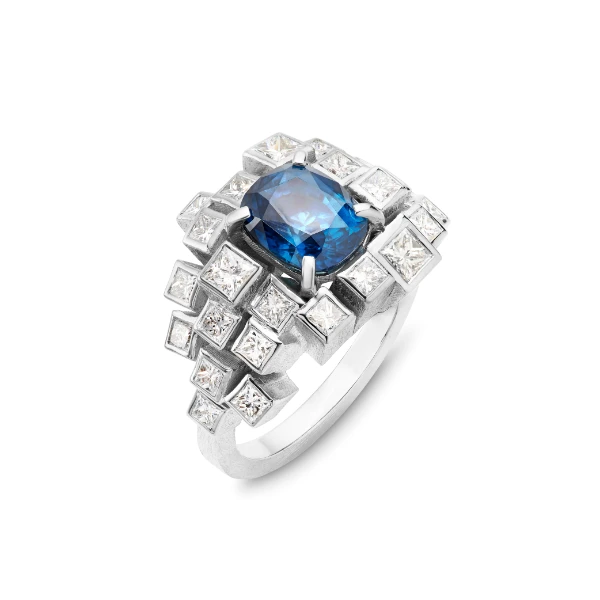 Af 14 karat hvidguld med en antiksleben safir på 3.11 carat og i alt 1.41 carat princess-slebne diamanter