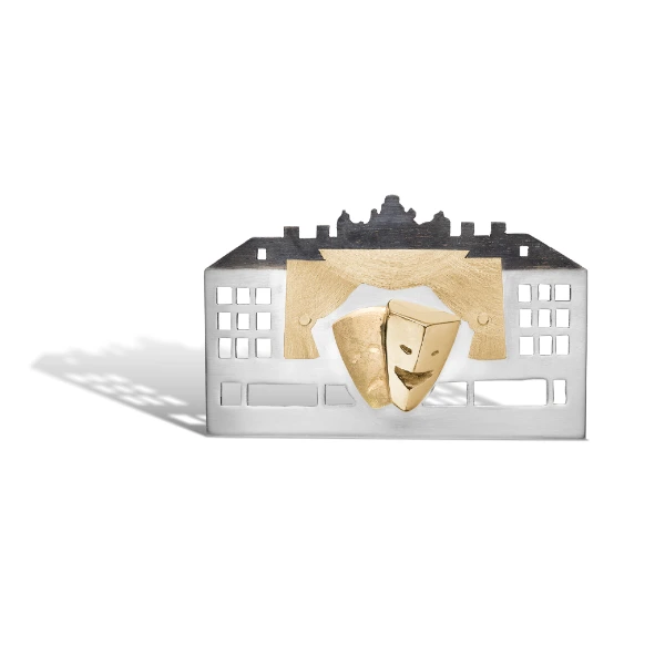 Som uddannet skuespiller (i 2004) og guldsmed (i 2021) har Charlotte Rathnov udformet en broche, der sammenfatter hendes to uddannelser og verdener. Bæres brochen på lyst tøj, kan man se lys gennem de udsavede vinduer i hotellets facade; bæres den på mørkt tøj, aner man det mørke, vi alle rummer. Vi gemmer os alle bag facader; de to guldmasker symboliserer glæde og tristhed og gardinet bragte lys i decembermørket på Kongens Nytorv, som teatrets magi giver lys og håb i vores liv