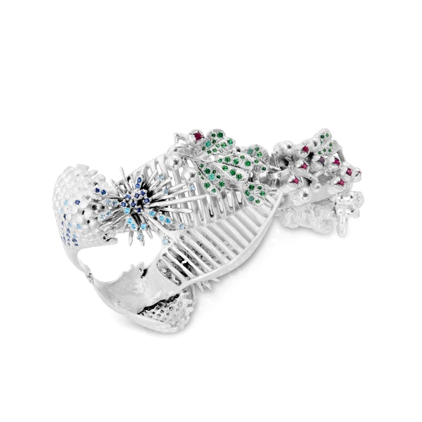 En servietring, der også kan anvendes som armring: Inspireret af d’Angleterres julebordes lysestage reflekterer ædelstenene på Susanne Pia Kristensens kreation højtidens jublende farver – de røde roser og den grønne mistelten