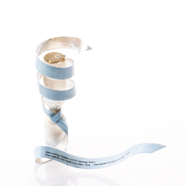 Knallertens oprindelse tilskrives en britisk konditor ved navn Tom Smith (1823-1869), der var inspireret af franske konditorers indpakning af søde sager i tyndt papir med et tvist i hver ende. I sit eget konditori i London byttede Smith godterne ud med små gaver i form af legetøj og andet nips, og ved at tilføje sølv-fulminat gav hans knallerter et ordentligt smæld, når trukket. I victoriansk tid var knallerten en dyr gave, som samlede hele selskabet. Charlotte Petermuss har fanget momentet lige efter at knallerten er trukket: Rummet er helt stille, sitrende af spænding. I den ene halvdel ligger en kostbar ring. Kærlighedsdigtet er et af de originale digte brugt af Smiths Christmas Crackers: Just a scrap of paper, yet its message hear; Ever and for ever shall I love thee, dear