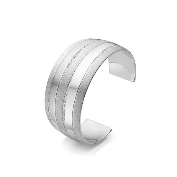 Armringens matte og blanke overflader afspejler kontrasten i tapetets brede striber, og det indfanger hotellets subtile, tidløse elegance i et bærbart kunstværk