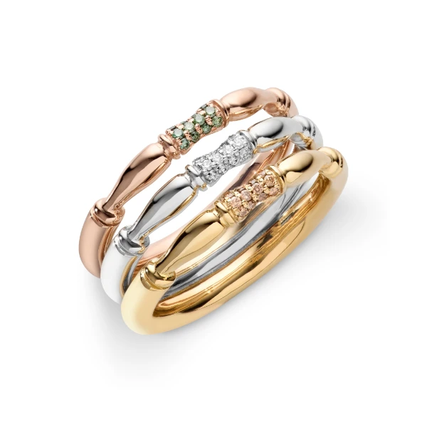 Af 14 karat rosa guld, 14 karat guld, 14 karat hvidguld og i alt 36 grønne, brune og farveløse diamanter (i alt 0.18 carat brillanter)