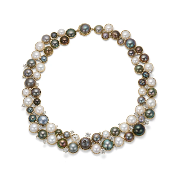 Af 14 karat guld, 165 diamanter (i alt 3.20 carat), Tahiti og ferskvandskulturhalvperler (diameterstørrelser 8 – 14 mm)